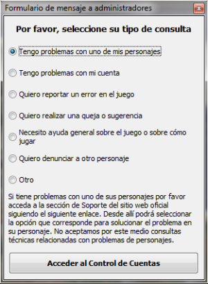 Puede enviarnos una denuncia informando la violación de los Términos de Uso del juego por parte de otro jugador. No nos envíe una denuncia si el hecho no acaba de suceder; en este caso acceda a la sección de Preguntas Frecuentes (FAQ) en la sección de Soporte del Control de Cuentas del sitio web oficial para saber como actuar. Se recomienda enviar links a fotos y videos para facilitar la revisión de la denuncia. También acceder a esta sección utilizando el comando /DENUNCIAR.