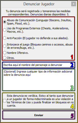 Como bien dice la palabra, el comando /denunciar es una herramienta In-Game que nos permite denunciar ciertas actitudes de jugadores que creemos/sabemos que están mal y deben ser corregidas por un administrador. Diariamente podremos hacer un máximo de 5 (cinco) denuncias.