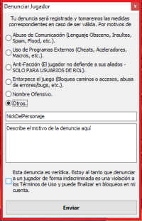 - Motivo del reporte (insultos, uso de programas externos, estafas, molestias)