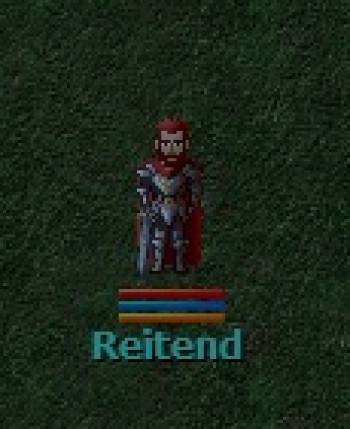 Reitend tiene una estatura promedio de ciento setenta y cinco centímetros. Posee un cuerpo tonificado y musculoso. Su barba y su cabello son de un color rojo vibrante. Su piel clara, marcada por el paso del tiempo, refleja una vida de arduo trabajo. Sus ojos, de un marrón profundo, irradian una calma serena y una penetrante sabiduría. Es conocido por ser honesto, empático y generoso. Su notable capacidad para escuchar a los nuevos aventureros lo convierte en un consejero valioso y un líder de confianza. Es paciente y disciplinado, cualidades que se manifiestan en su trato tanto con los feligreses como con aquellos que buscan su guía. Dotado de una gran fortaleza interior y una determinación inquebrantable, siempre trata de enfrentar las adversidades con plena serenidad.
