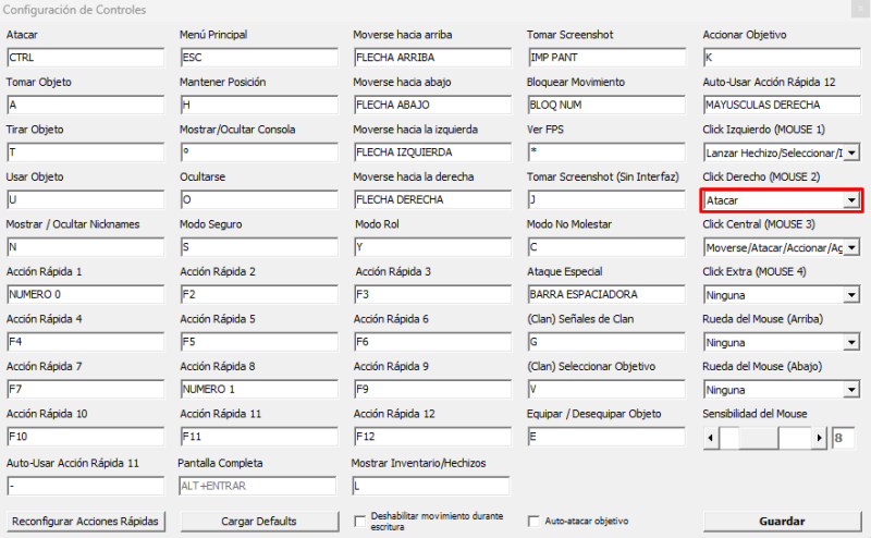 Luego de hacer Clic se abrirá la configuración de teclas y acciones, una vez allí hay que tildar la opción que dice “Atacar”. También se podrá poner la opción de Moverte/Atacar/Accionar/Agarrar.