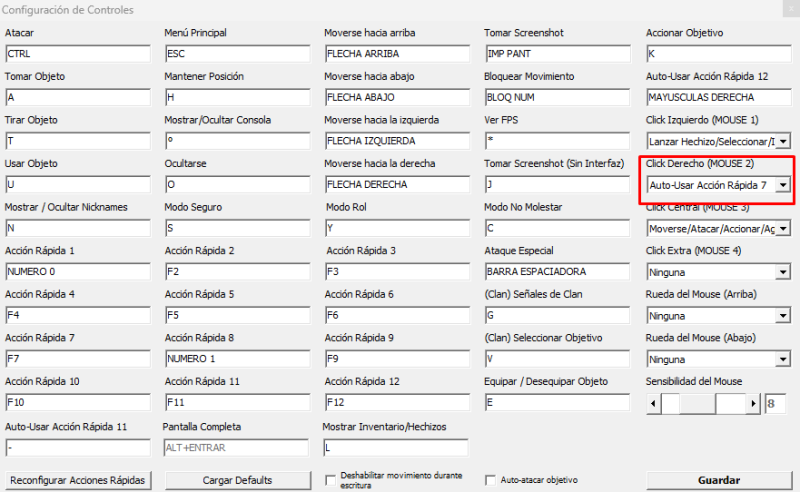Una vez que definimos el auto-atacar, hay que elegir una acción por el cual activarlo. En este caso lo haremos con “Acción MOUSE 2”, que vendría a ser el clic derecho del mouse.